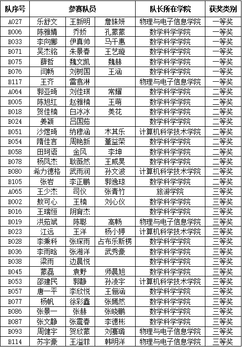 yL23411永利第七届数学建模竞赛暨2024年全国大学生数学建模竞赛校级选拔赛于2024年6月22日举行。次比赛共有来自yL23411永利集团、物理与电子信息学院、计算机科学技术学院、地理科学学院、旅游学院、教育学院等六个学院共118支队伍参赛,组委会共收到论文110篇。经过组委会的认真评阅,共评出一等奖7组,二等奖10组,三等奖16组。具体名单如下: