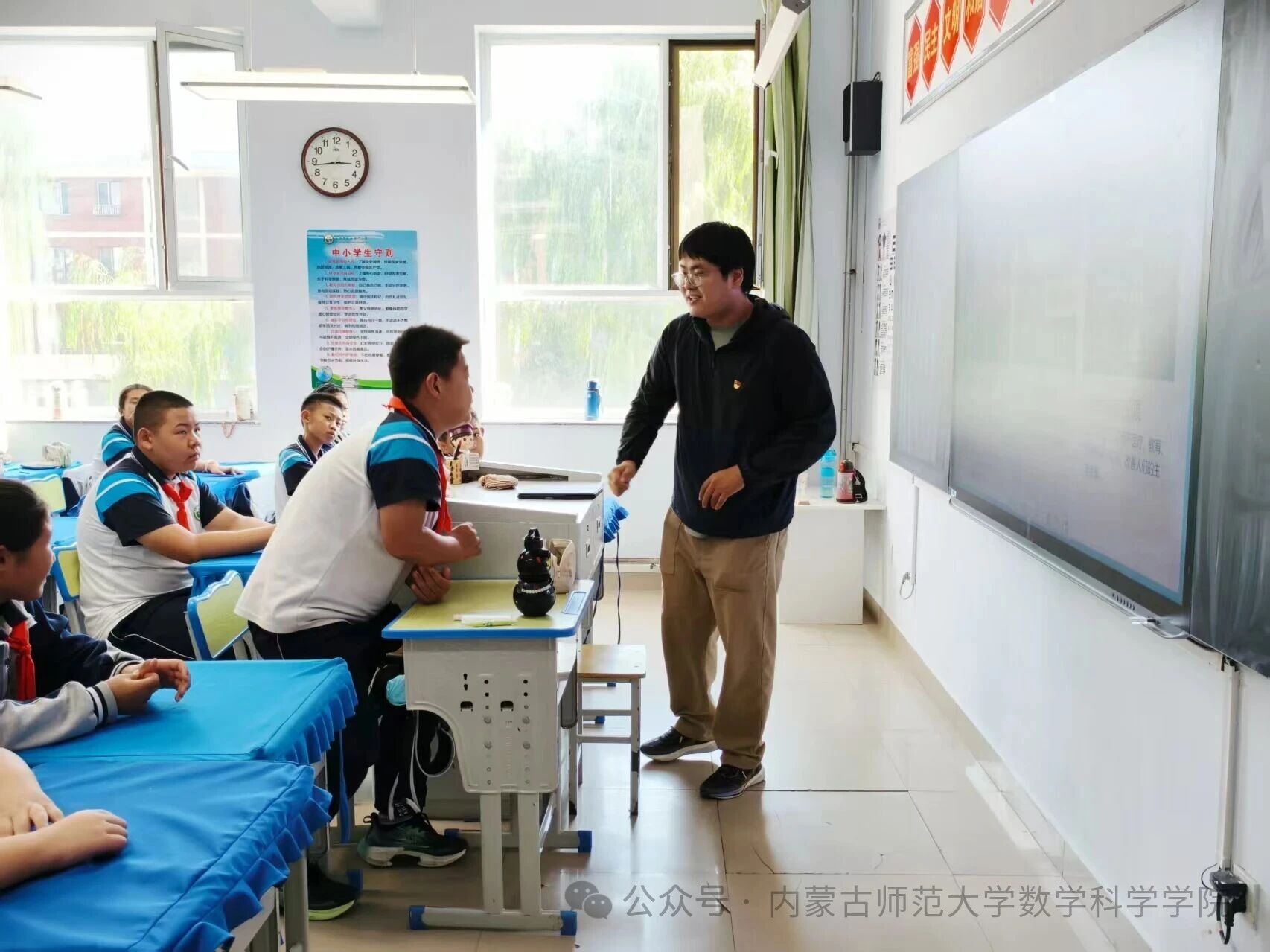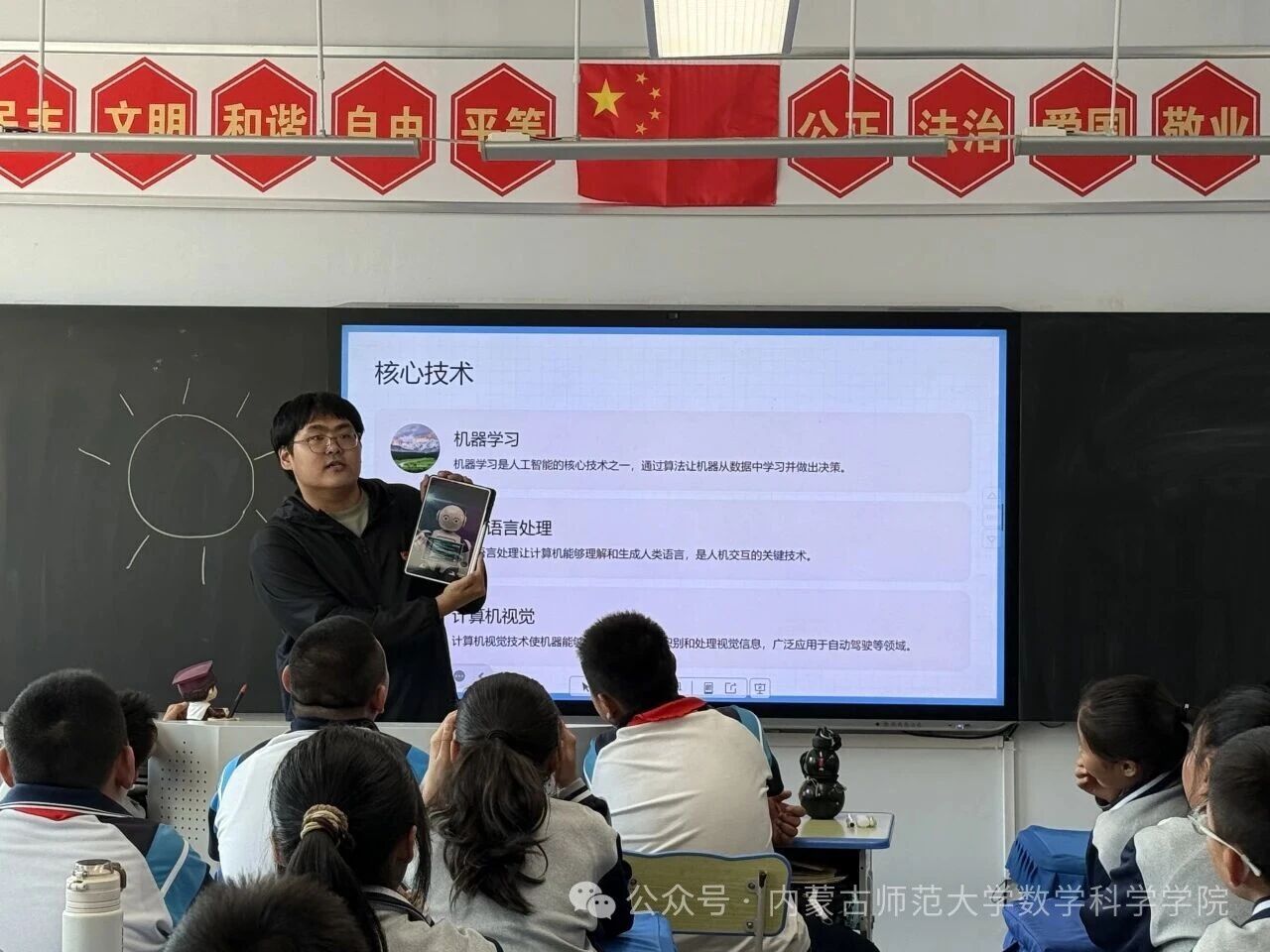 在和林格尔县乳业开发区第一小学,内蒙古科学技术普及学会兼职副秘书长、yL23411永利集团博士研究生乌日乐等一群研究生科普志愿者,他们用所学的“数据科学与智能信息处理”“基础数学”“应用数学”等学科专业,用通俗易懂的语言,为小学生普及“人工智能是什么”“人工智能会做什么”“机器是怎样看懂图像的”,通过活动让学生积极体验,在活动中感知科技、思考未来、收获新知。