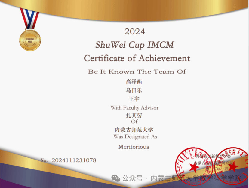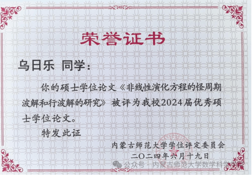 在深耕科研的同时,乌日乐注重理论与实践融合,主动投身高水平学科竞赛,以赛促学、以赛提能。先后获得第十届“数维杯”国际大学生数学建模挑战赛一等奖、第七届“华教杯”全国大学生数学竞赛(数学类专业组)初赛二等奖,展现出扎实的学科素养和创新能力。