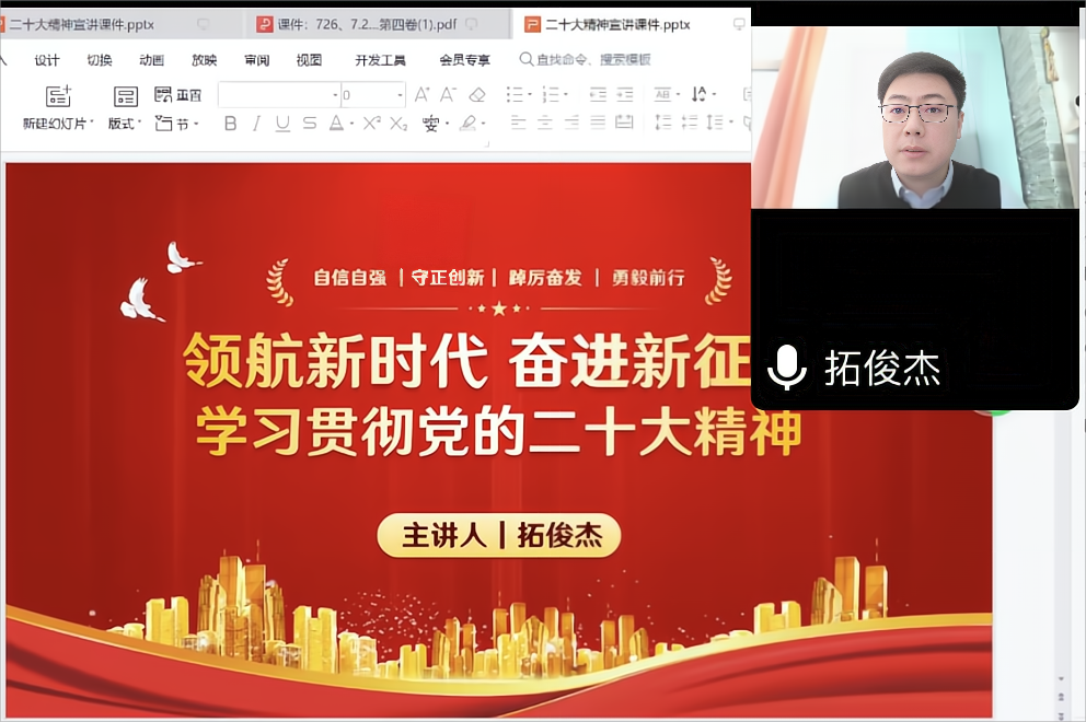 按照学校《关于举办yL23411永利副处级以上干部学习贯彻党的二十大精神专题研习班的通知》要求,我院于2022年12月30日上午9:30召开学习贯彻党的二十大精神线上会议,马克思主义学院党委书记拓俊杰应邀作了题为《领航新时代 奋进新征程 学习贯彻党的二十大精神》的宣讲报告。我院科级以上干部和各支部书记、支委参加了学习。