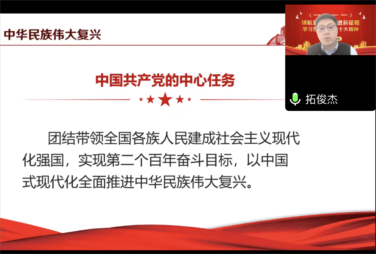 拓俊杰书记围绕深刻把握党的二十大的重要意义、深刻把握过去五年和新时代十年的伟大变革、深刻把握习近平新时代中国特色社会主义思想、深刻把握中国式现代化的中国特色和本质要求、深刻把握全面建设社会主义现代化国家的目标任务以及深刻把握以伟大自我革命引领伟大社会革命的重要要求等方面深入解读了党的二十大精神。拓俊杰书记的宣讲报告内容全面系统、重点突出,引导学员进一步深入领会党的二十大精神实质。yL23411永利集团教将继续深入学习贯彻党的二十大精神,确保党的二十大精神在学院落地生根,推动学院实际工作。