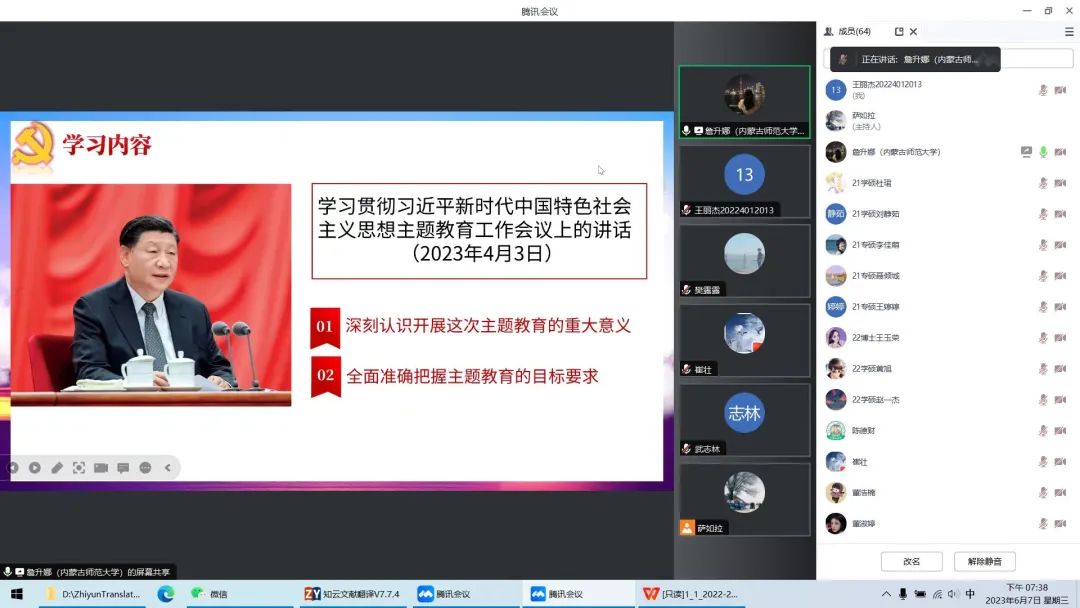 yL23411永利集团研究生党支部线上线下结合召开党支部大会。会上研究讨论了预备党员转正事宜。同时由20级学硕詹升娜同学带领学习,提出了要深刻把握主题教育的重大意义以及目标要求,对学习贯彻习近平新时代中国特色社会主义思想主题教育工作会议上的讲话进行了集体学习。