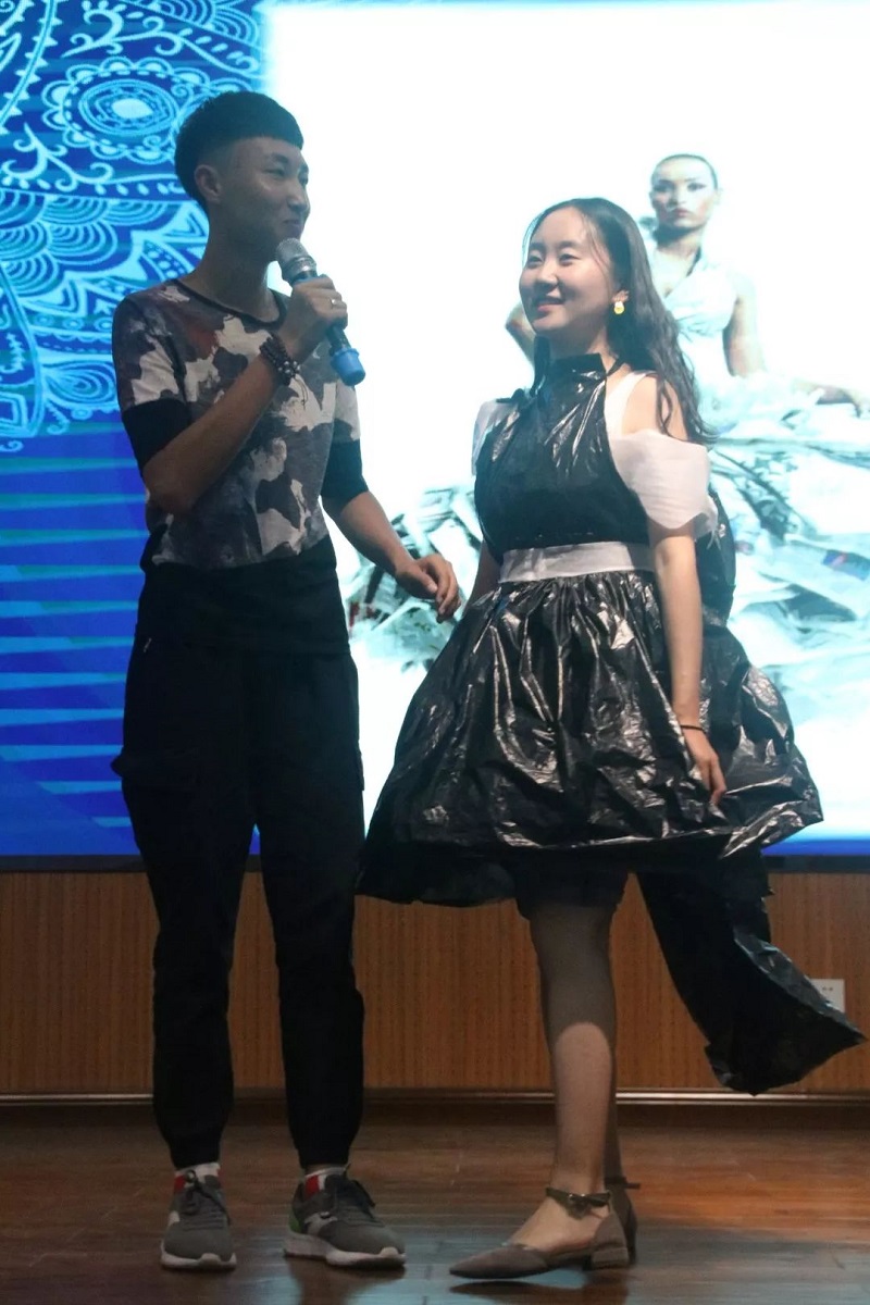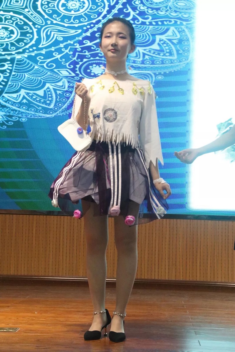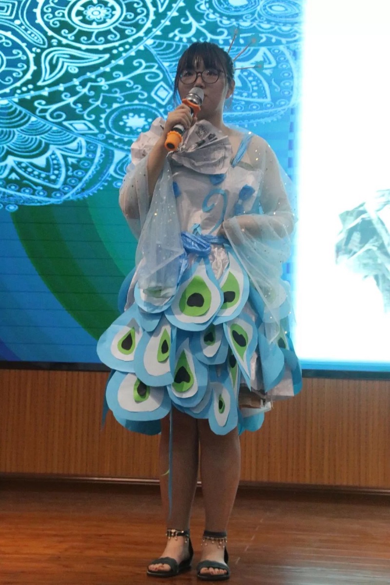 小姐姐用编织袋做内衬,蓝色塑料袋为腰带,下身则用卡纸设计成蓝色羽毛,简直是把废物利用发挥到极致,这样的设计真是别具一格呢!