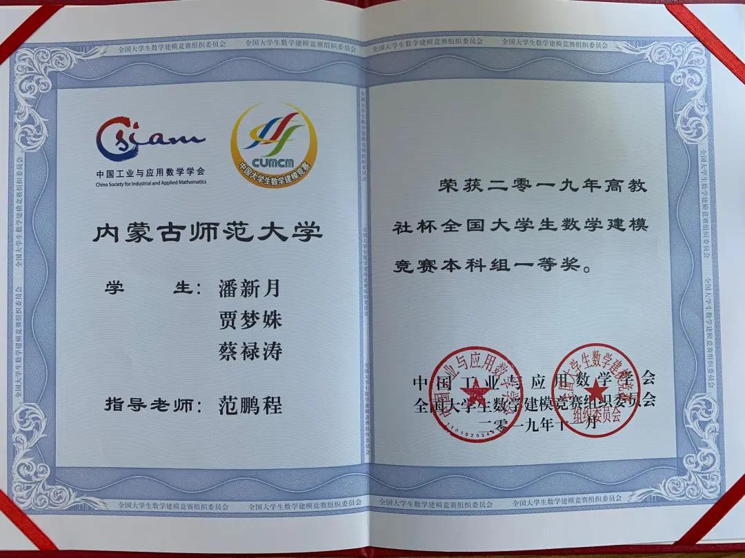 2019高教杯全国大学生数学建模竞赛,我院潘新月、贾梦姝、蔡禄涛荣获一等奖!
