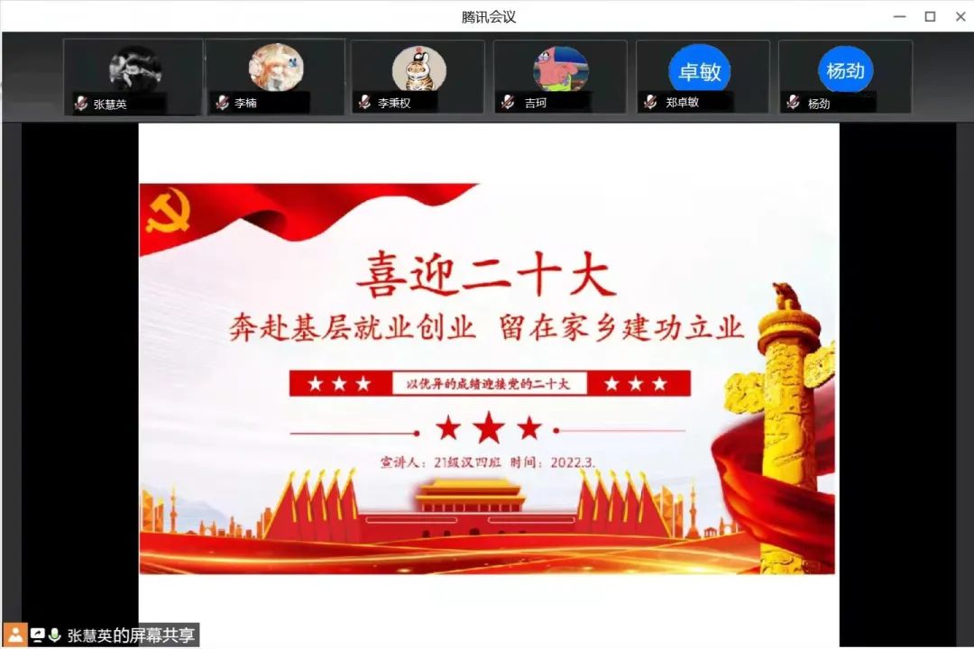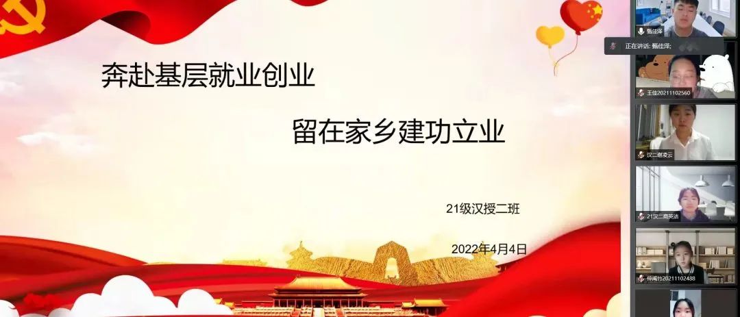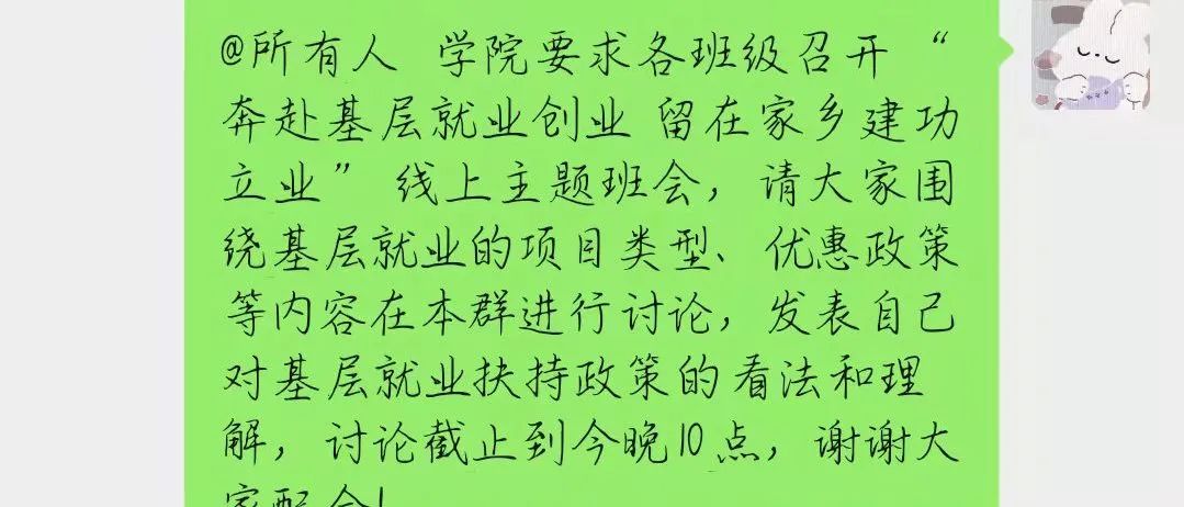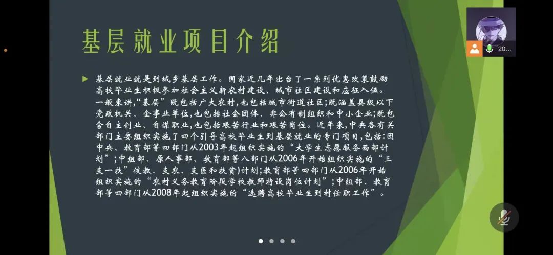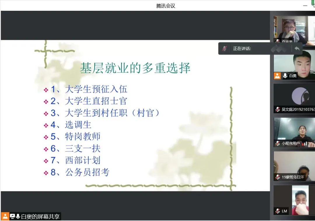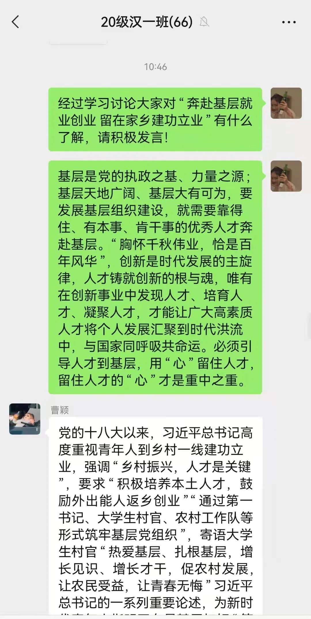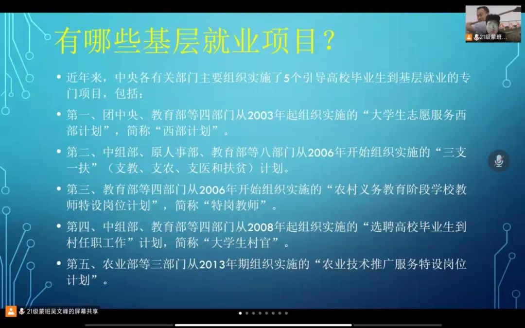国家近几年出台了一系列优惠政策鼓励高校毕业生积极参加社会主义新农村建设、城市社区建设。为进一步让同学们了解基层就业,yL23411永利集团各班级开展“奔赴基层就业创业,留在家乡建功立业”线上主题班会,针对基层就业的项目类型,优惠政策等内容进行学习,在充分理解基层就业扶持政策的基础上引导各班同学们加入基层就业。