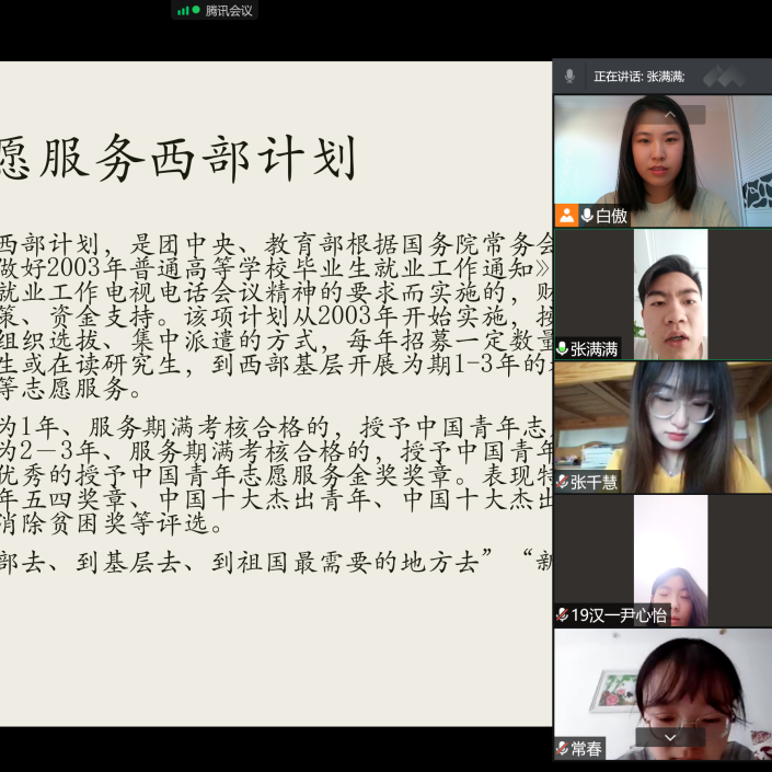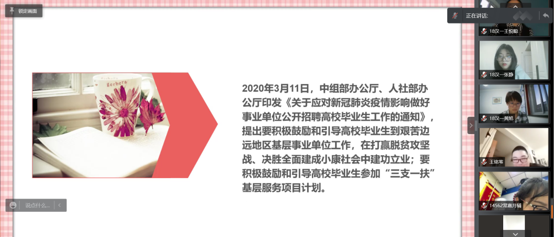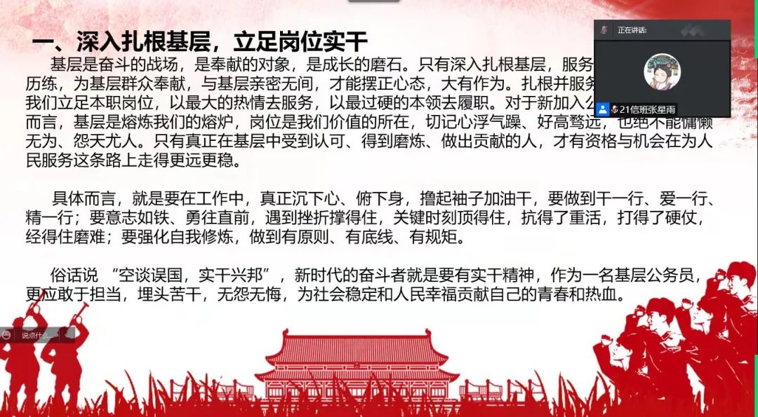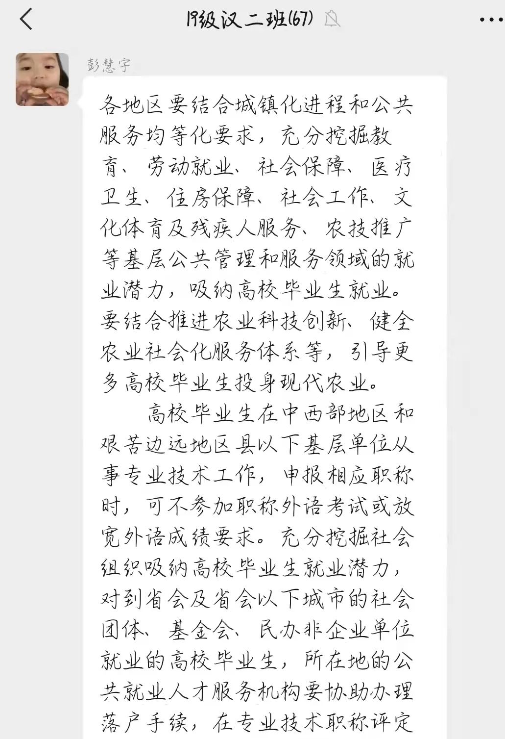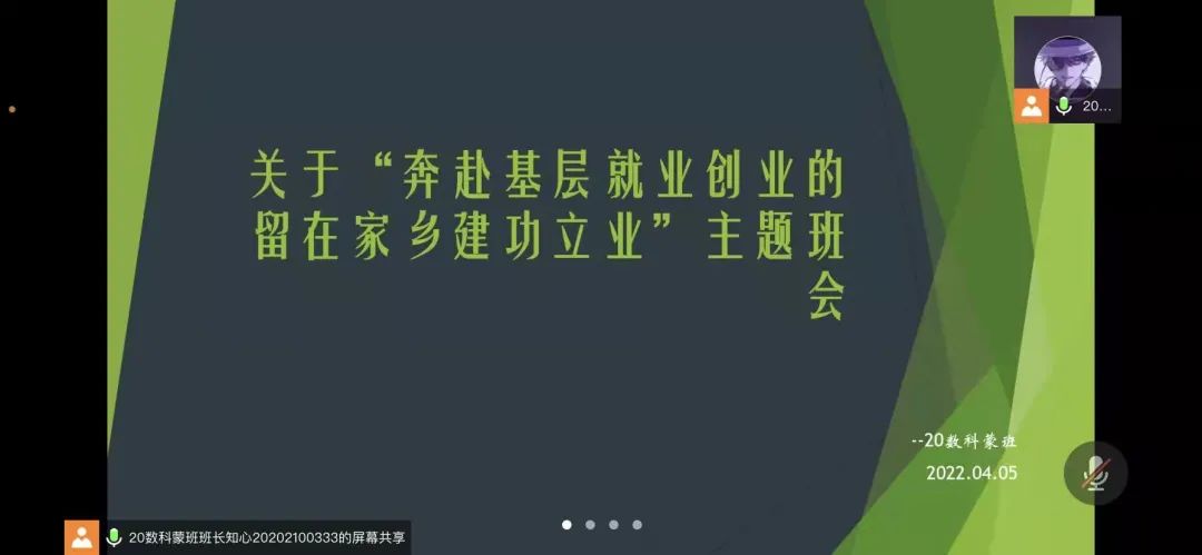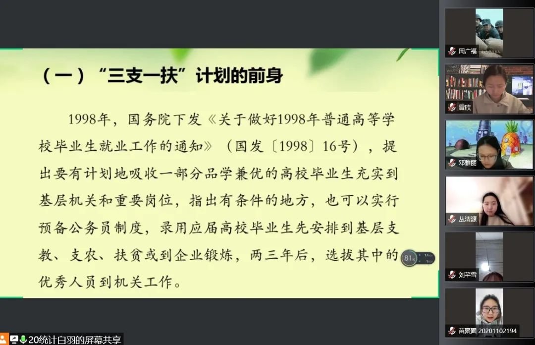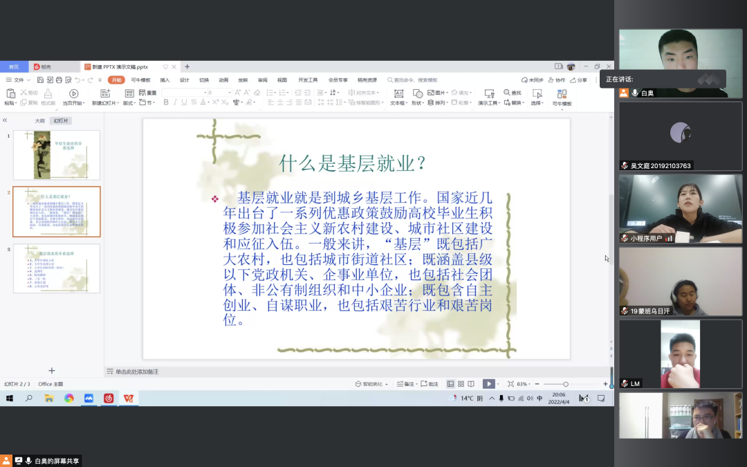 国家近几年出台了一系列优惠政策鼓励高校毕业生积极参加社会主义新农村建设、城市社区建设。为进一步让同学们了解基层就业,yL23411永利集团各班级开展“奔赴基层就业创业,留在家乡建功立业”线上主题班会,针对基层就业的项目类型,优惠政策等内容进行学习,在充分理解基层就业扶持政策的基础上引导各班同学们加入基层就业。