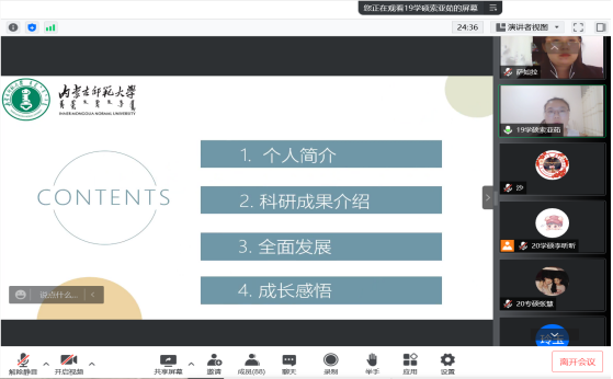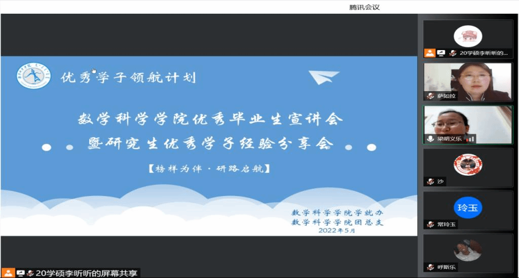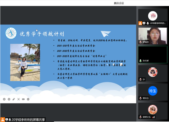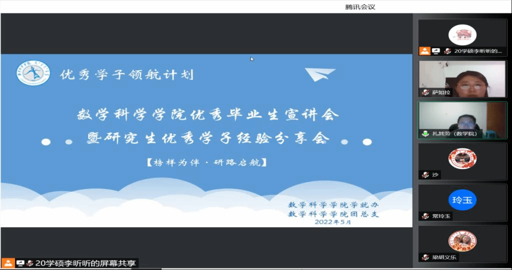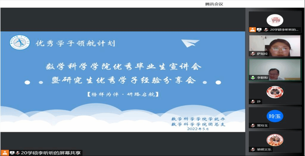 为了充分发挥研究生优秀学子的示范引领作用,更好地落实《yL23411永利关于开展“榜样为伴·研路启航”研究生国家奖学金获得者事迹宣传活动的通知》《内蒙古自治区教育厅关于报送2022年春季学期研究生教育教学典型案例的通知》《关于组织开展yL23411永利“学生劳动教育宣传月”活动的通知》等文件要求,我院于5月23日晚,组织全体研究生开展“yL23411永利集团优秀毕业生宣讲会暨研究生优秀学子经验分享会”,邀请我院2021年度国家奖学金获得者索亚茹、张慧,2021年度自治区奖学金获得者孙天娇、谭晓漫,2021-2022年度自治区“优秀毕业生”李星然、“三好学生”索亚茹,共5名优秀学子为大家分享自己学习生涯中的经验和感悟。