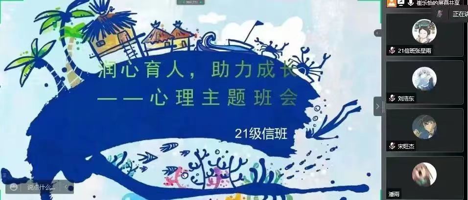 主题班会以线上腾讯会议的方式开展,各班召开主题班会介绍了5.25大学生心理健康日的由来、大学生心理健康的重要性、学校心理健康教育的服务机构以及服务的内容。