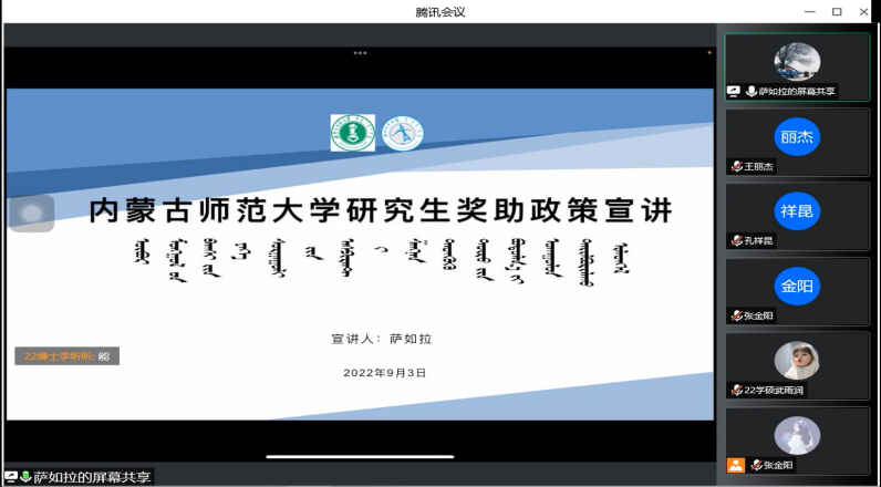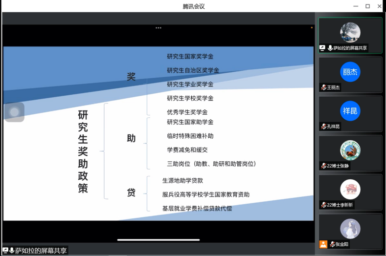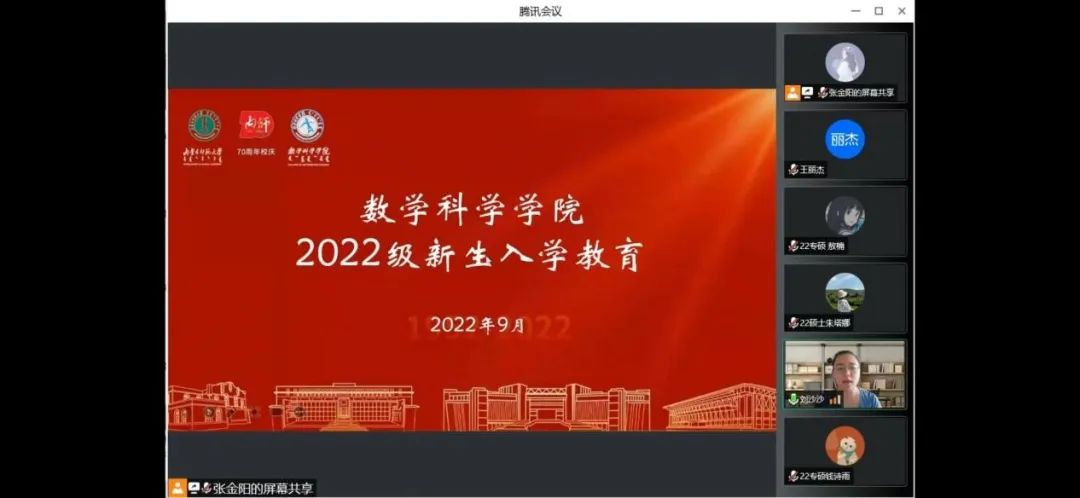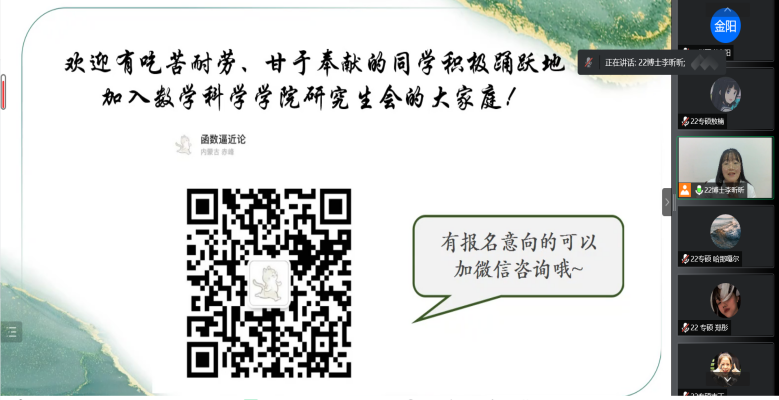2022年9月3日晚20:30,我院举办了线上新老生见面交流会,两校区全体研究生参加此次活动,活动由20级学硕李昕昕同学主持。张静同学、李颖同学、李昕昕同学分别对学院研究生党支部、研究生团支部、研究生会分别做了介绍及招新安排,同时希望同学们积极参加学生组织,在学习生活之余提升自己各方面能力。