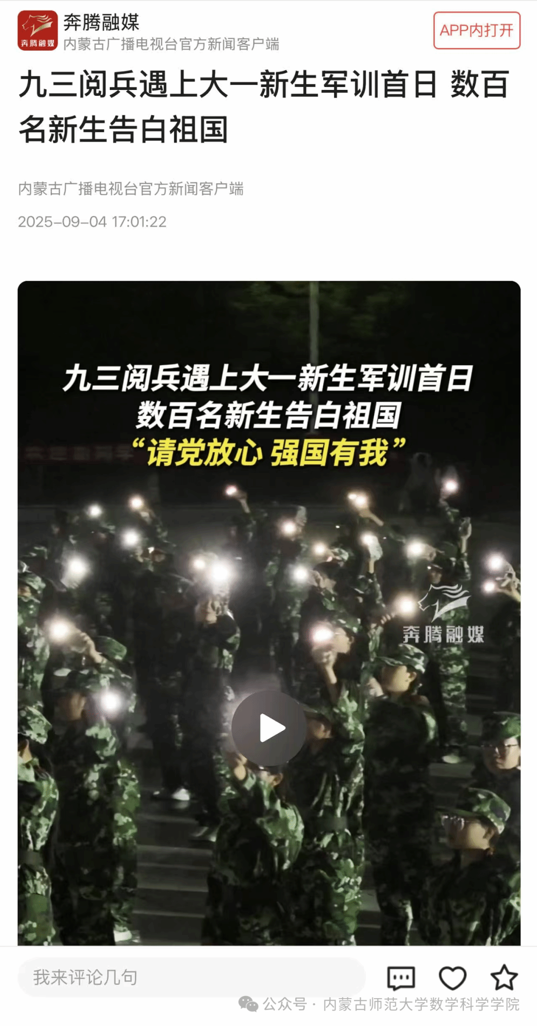 图片说明:内蒙古广播电视台官方新闻客户端发布我院新生用歌声表白祖国