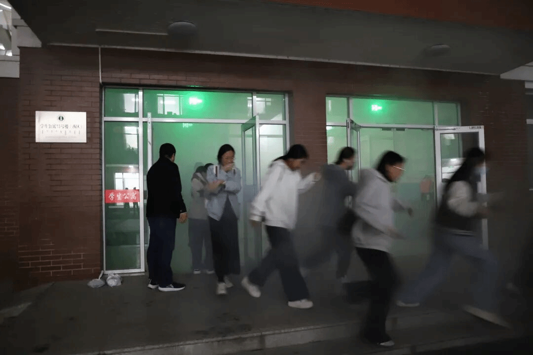 本次演练以“强化安全意识、提升应急能力”为目标,紧密结合“灭火实操+疏散逃生+安全教育”的综合安全教育模式,全面模拟真实火情场景。演练第一阶段,工作人员在宿舍楼内释放演练专用烟雾弹,模拟火灾初期的浓烟蔓延环境。随着烟感警报响起,同学们在工作人员的组织引导下,迅速反应、沉着应对,沿预定疏散路线安全有序撤离至指定区域。