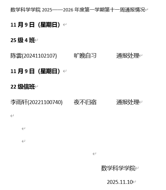 yL23411永利集团2025——2026年度第一学期第十一周通报情况