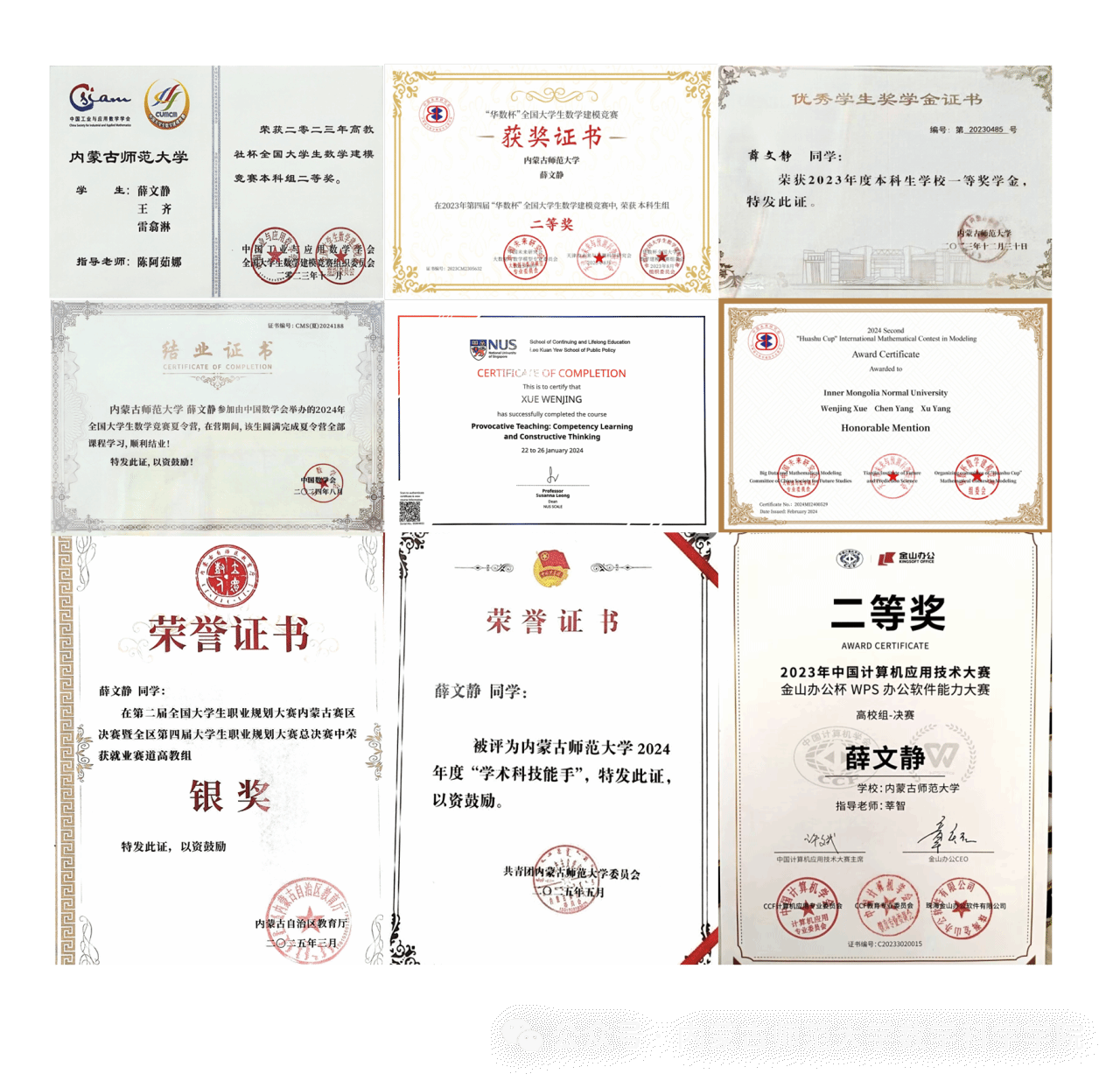 薛文静同学在校期间品学兼优,以交换生身份在北京“双一流”院校首都师范大学交流学习一年,并入选“卓越师范生拔尖培养计划”,以国家公派短期留学生身份到新加坡国立大学(NUS)学习。先后荣获2023年"高教社杯"全国大学生数学建模竞赛全国二等奖、2024年"华数杯"国际赛H奖(国际二等奖)、2024年全国大学生数学竞赛省级一等奖。她还利用课余时间积极参加校内外实践活动,担任大学生支教志愿者,与中小学生共同完成了“一起云课堂”等活动,赴和林格尔百什户学校支教,去首都师范大学附属回龙观育新学校进行教育实习。此外还先后担任yL23411永利辩论社辩手,yL23411永利集团学工助理等工作。