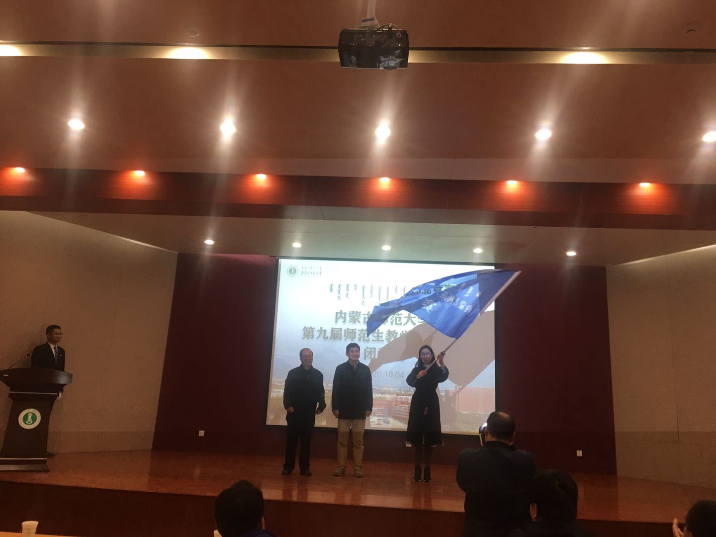 最后,我院作为第十届师范生教学技能竞赛承办方,副院长包霞、教务处处长韩巍从教育学院院长米俊魁手里接过了赛旗。