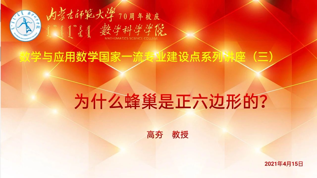 2021年4月15日,我院于yL23411永利盛乐校区学生事务中心学术报告厅开展了“数学与应用数学国家一流专业建设点”系列讲座第三讲。我院荣幸邀请到东北师范大学数学与统计学院教授、博士生导师高夯教授作为此次讲座的主讲人。参加本次讲座的老师有学院党委书记扎其劳老师,学院党委副书记、副院长季建光老师,学院副院长包霞老师,学院教授、硕士研究生导师毕力格图老师,学院教授、硕士研究生导师李春兰老师,学院团总支书记皮建东老师以及20级蒙班班主任娜仁格日乐老师。