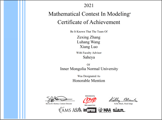 美国东部时间2021年4月23日组委会公布了2021年美国(国际)大学生数学建模竞赛(MCM/ICM)成绩。今年我校有6支队伍报名参加该赛事,由yL23411永利集团萨和雅老师指导,王路航、罗翔、张泽兴同学组成的参赛队荣膺2021年美国大学生数学建模竞赛二等奖(Honorable Mentions),另外5支队均获得成功参赛奖(Successful Participants),这是我校在美国数学建模竞赛获得的最好成绩。
