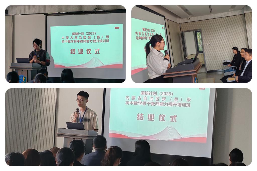 学员代表乌海市第九中学张宇婷老师、包头市石拐区第一中学赵智敏老师、赤峰市经棚二中贾元珷老师分享了此次培训学习的心得,展现了满满的收获。张宇婷老师表示参加这次培训意义非凡,不仅提高了自身的能力和素质,也体会到了团队的力量和同仁的情谊,所学到的知识会对以后的教科研工作有着重要的指导意义,同时,也表达了为此次培训付出辛勤劳动的领导、老师及工作人员的衷心感谢、对学员们的美好祝福;赵智敏老师从新课标的角度分享了个人心得,对于新课标有了更清楚的认识与理解,为日后的教学工作指明了方向,也表达了通过这次培训,结识了许多优秀的同行老师,与其交流、探讨,拓宽了自身眼界,为将来的教科研的顺利开展搭建了很好的平台;贾元珷老师表示这次的培训是教学路上的一笔宝贵财富,通过这两周的学习,收获满满,受益颇多,对于数学教学有了更新的认识,对于改进课堂教学、开展教学研究充满了信心。