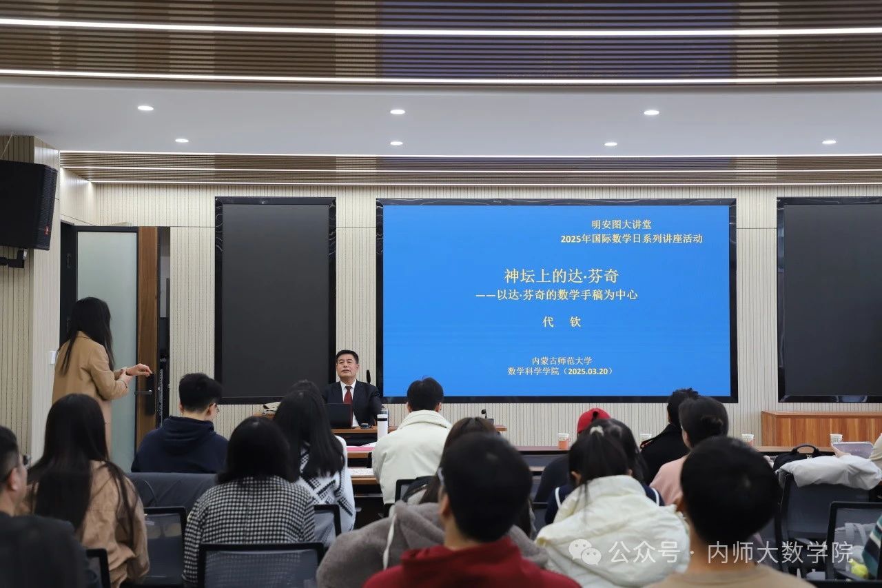 3月20日下午,yL23411永利集团“3.14国际数学日系列活动”——明安图大讲堂第四讲在yL23411永利盛乐校区内蒙古自治区应用数学中心报告厅进行。yL23411永利科学技术史研究院代钦教授应邀作了题为“神坛上的达·芬奇——以达·芬奇数学手稿为中心”的学术讲座。我院师生代表100余人聆听了本次讲座,讲座由包霞副院长主持。