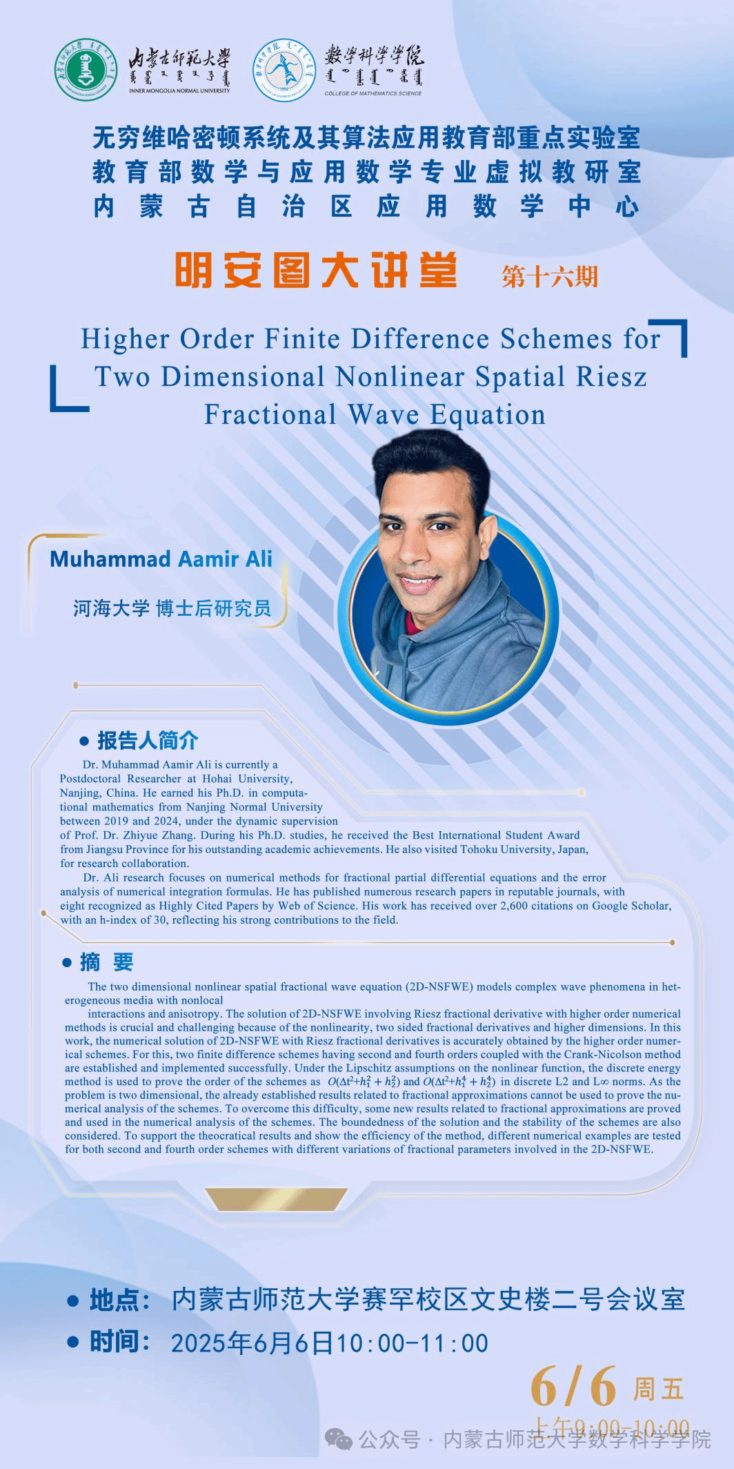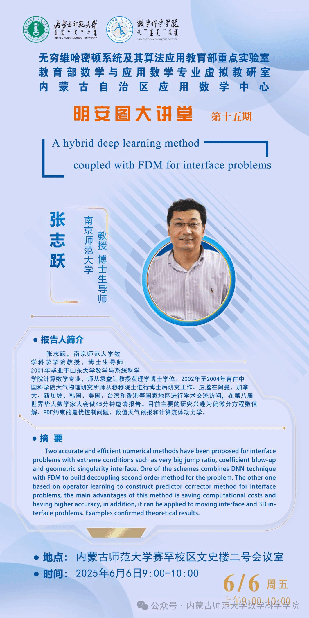 6月6日,yL23411永利集团明安图大讲堂在yL23411永利赛罕校区文史楼2号会议室成功举办。本次讲座特邀南京师范大学张志跃教授与河海大学博士后研究员ALI作专题学术报告。两场报告分别聚焦深度学习求解界面问题与分数阶微分方程的高精度数值方法,现场互动热烈。