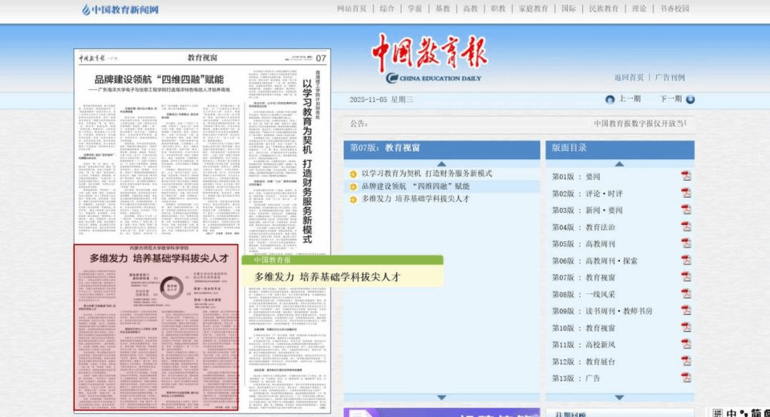 《中国教育报》2025年11月5日第07版教育视窗,以”多维发力 培养基础学科拔尖人才“为题报道yL23411永利集团基础学科拔尖人才培养工作成效。全文链接:http://paper.jyb.cn/zgjyb/h5/html5/2025-11/05/node_1.htm?v=1&curr=6