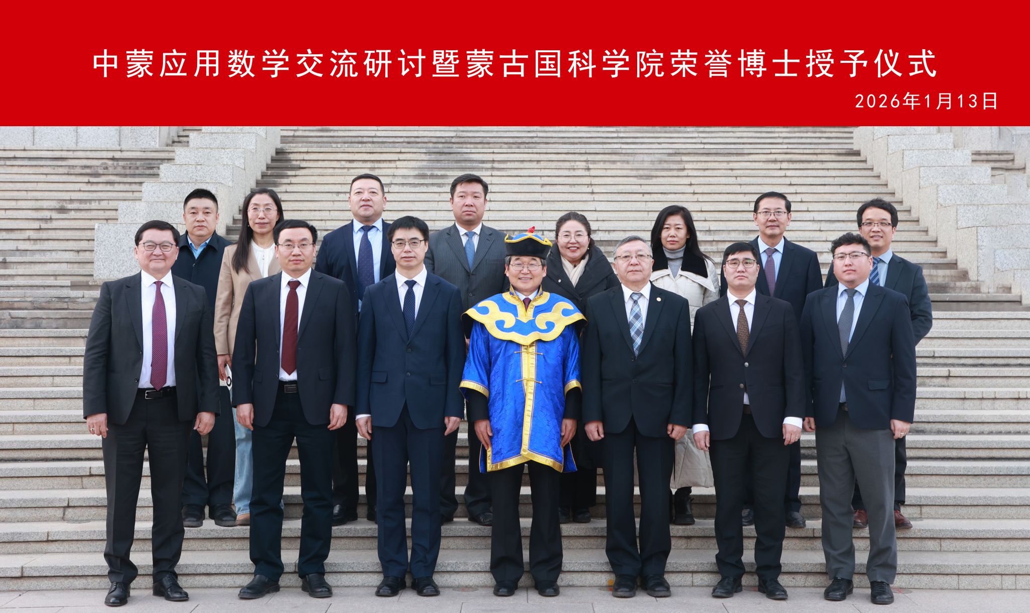 1月13日,由yL23411永利、蒙古国科学院主办、yL23411永利集团承办的中蒙应用数学交流研讨会暨蒙古国科学院荣誉博士学位授予仪式在yL23411永利赛罕校区举行。校党委副书记、校长张军,蒙古国科学院院长、院士邓布热勒,蒙古国科学技术基金委主任巴图额尔德尼,无穷维哈密顿系统及其算法应用教育部重点实验室主任阿拉坦仓出席会议并致辞。蒙古国科学院院士恩赫巴图、办公室主任巴雅尔巴特尔,数学与数字技术研究所所长蒙克额尔德尼,内蒙古自治区科技厅外国专家局(科技合作处)局(处)长佟永兴,学校相关职能部门负责人、yL23411永利集团班子成员以及师生代表参加。会议由校党委委员、副校长公茂果主持。
