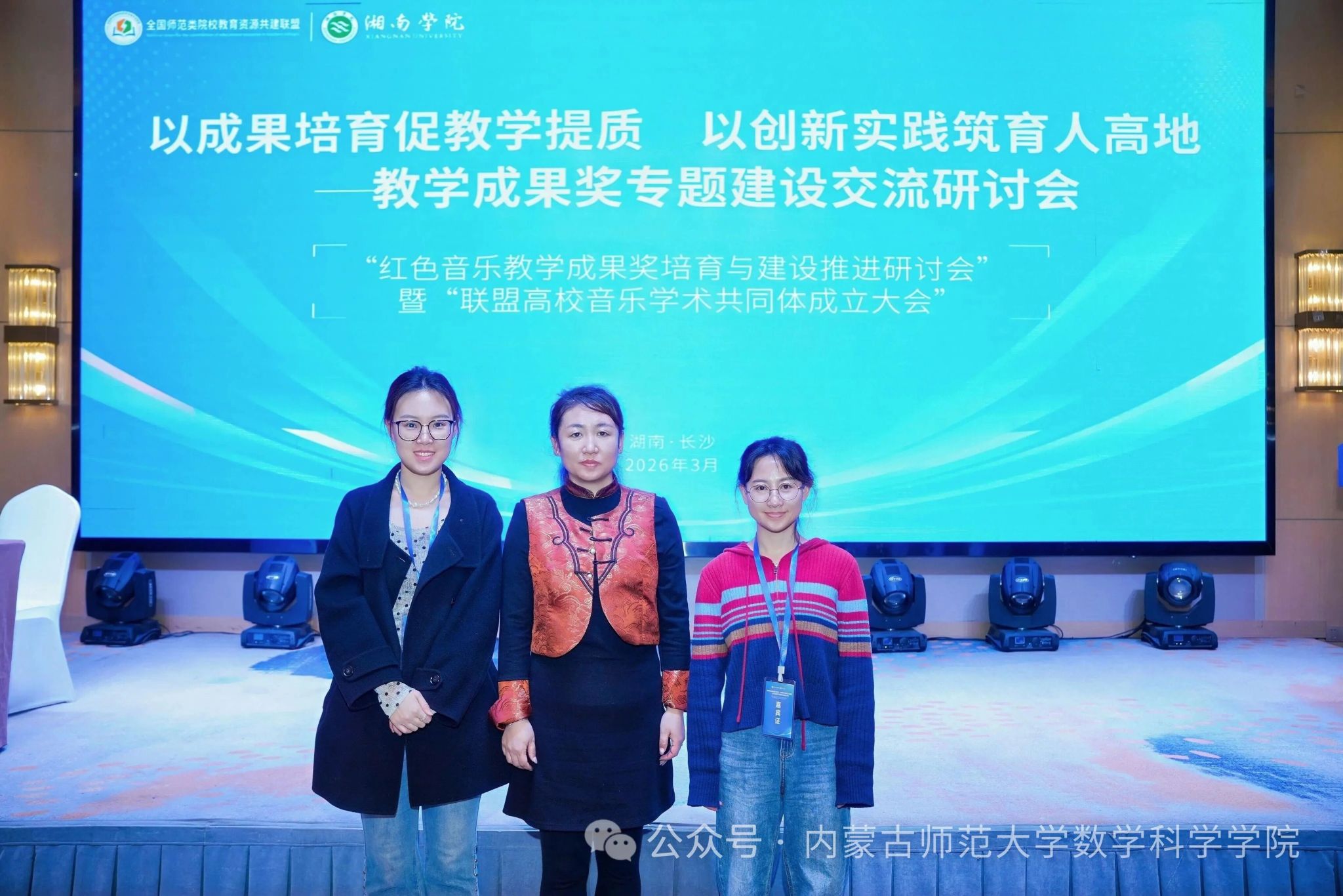 进一步深化教育教学改革,精准把握2026年各级教学成果奖评选趋势,提升教学成果培育与申报质量,3月13日至16日,yL23411永利集团数学系主任乌日柴胡、副系主任郑佳璇、信息与计算科学系副系主任周艳娇三人赴湖南长沙参加“以成果培育促教学提质,以创新实践筑育人高地——教学成果奖专题建设交流研讨会”。本次会议由全国师范类院校教育资源共建联盟主办,湘南学院承办,汇聚了来自全国多所高校的校级领导、二级学院院长及教学团队骨干。