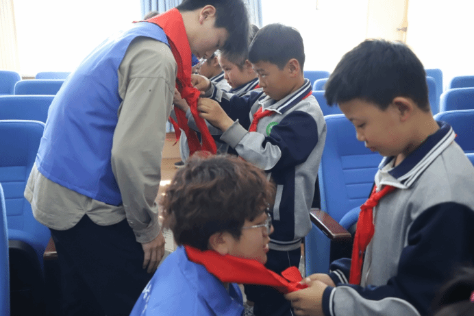 仪式现场,小学生代表为结对大学生志愿者佩戴红领巾,大学生志愿者为孩子们赠送礼物,双方交换筑梦启航信息卡,正式结成帮扶对子,传递温暖与希望。