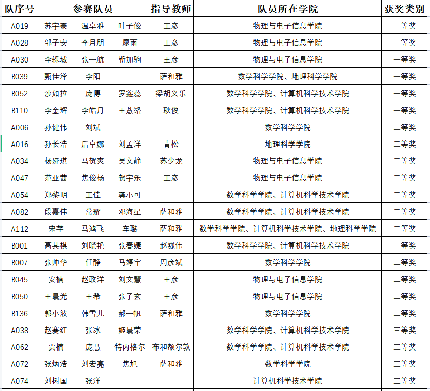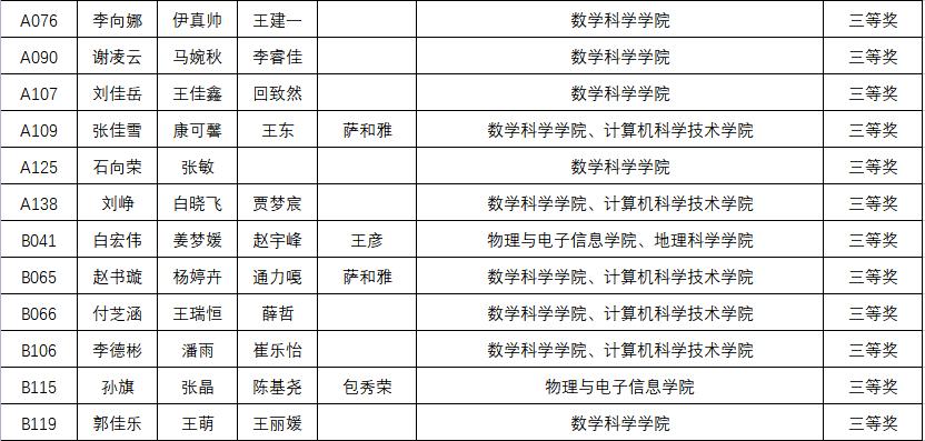 yL23411永利第六届数学建模竞赛暨2023年全国大学生数学建模竞赛校级选拔赛于2023年5月12日至5月15日举行。本次比赛共有来自yL23411永利集团、计算机科学技术学院、物理与电子信息学院、经济管理学院、地理科学学院、化学与环境科学学院、旅游学院、教育学院、心理学院、文学院、外国语学院等11个学院共143支队伍参赛,组委会共回收论文113篇。经过组委会的认真评阅,共评出一等奖6组,二等奖12组,三等奖16组。具体名单如下: