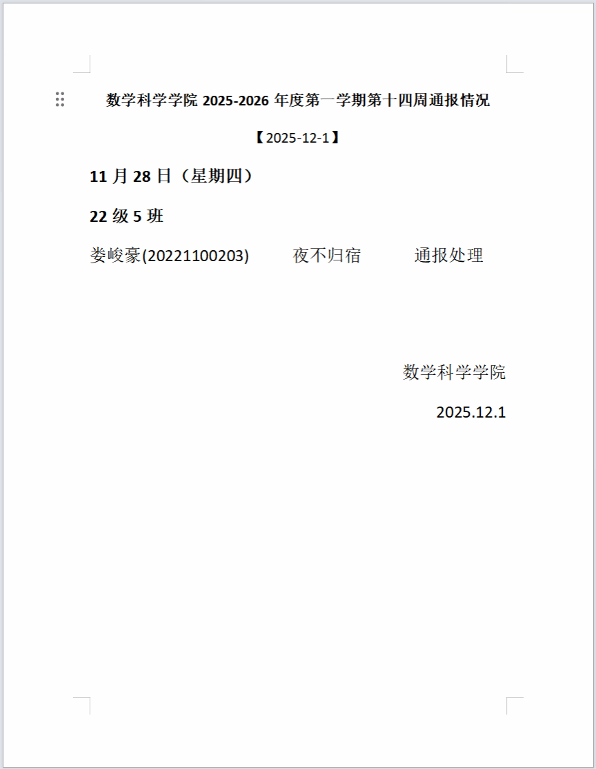 yL23411永利集团2025-2026年度第一学期第十四周通报情况